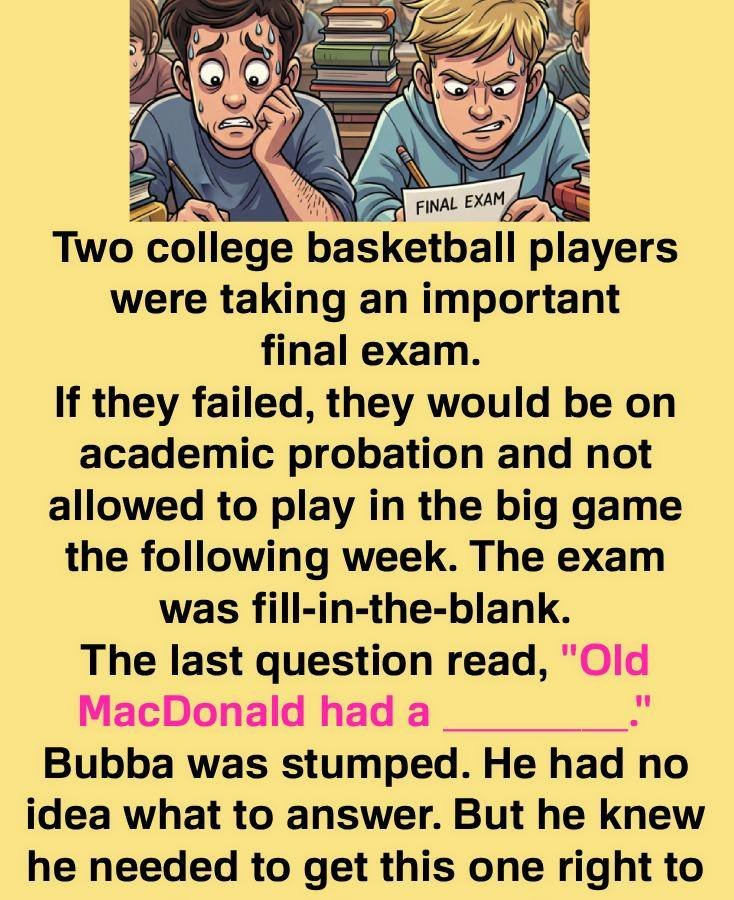 Two college basketball players were taking an important final exam. If they failed, they would be on academic probation and not allowed to play in the big game the following week. The exam was fill-in-the-blank.