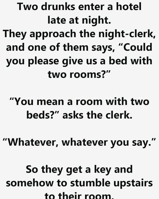 Two drunks enter a hotel late at night. They approach the night-clerk, and one of them says, “Could you please give us a bed with two rooms?”