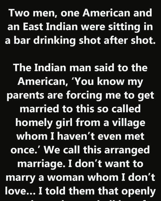 Two men, one American and an East Indian were sitting in a bar drinking shot after shot. The Indian man said to the American, ‘You know my parents are forcing me to get married to this so called homely girl from a village whom I haven’t even met once.’ We call this arranged marriage. I don’t want to marry a woman whom I don’t love… I told them that openly and now have a hell lot of family problems.’