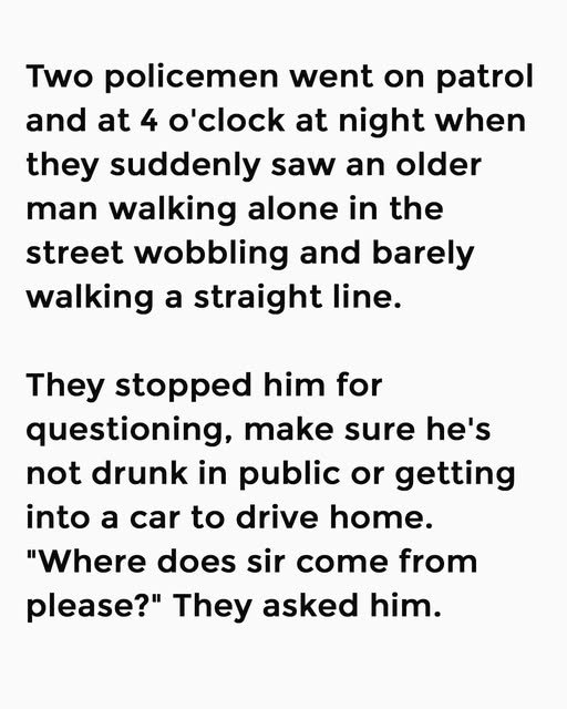 Two policemen went on patrol and at 4 o’clock at night when they suddenly saw an older man walking alone in the street wobbling and barely walking a straight line. They stopped him for questioning, make sure he’s not drunk in public or getting into a car to drive home. “Where does sir come from please?” They asked him.