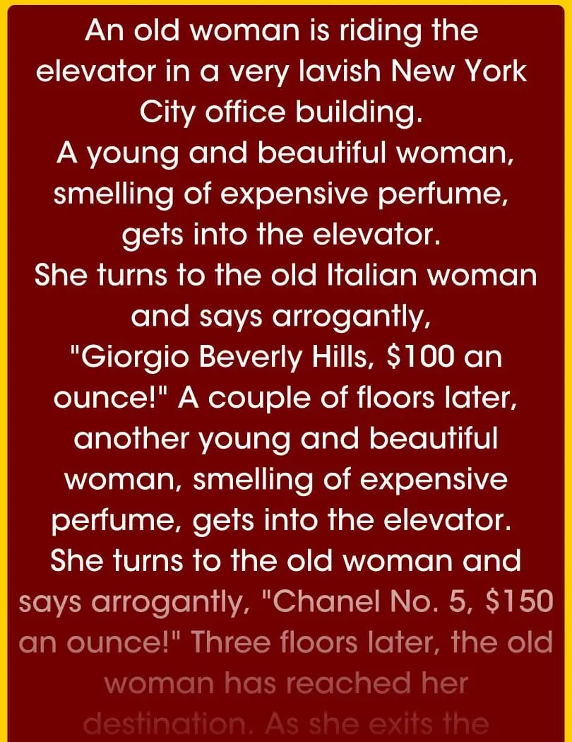 She turns to the old woman and says arrogantly, “Chanel No. 5, $150 an ounce!”