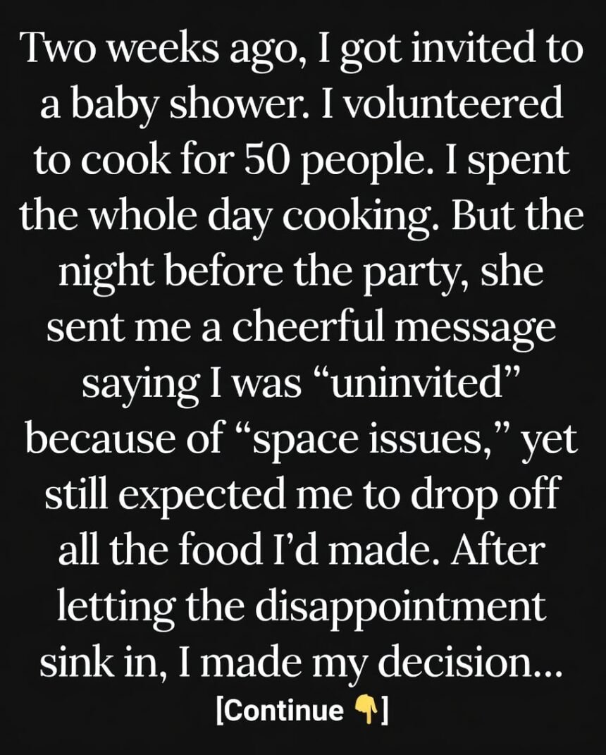 The night before the shower, everything changed with a single message. The host casually informed me that I was “uninvited” due to “space issues,” yet still expected me to deliver all the food I had prepared. There was no real apology, no acknowledgment of the time or heart I had invested—just an assumption that my contribution would remain, even if my presence did not.