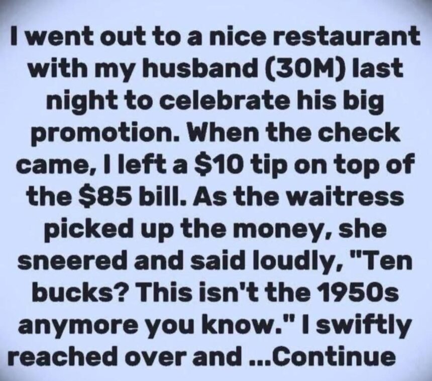 Amelia recently shared her frustrating restaurant experience, raising important questions about tipping etiquette and the quality of customer service today. What was supposed to be a celebratory dinner for her husband’s promotion turned sour due to an encounter with a rude waitress.After enjoying their meal, Amelia left a $10 tip on an $85 bill. However, the waitress responded with a sneer, saying, “Ten bucks?