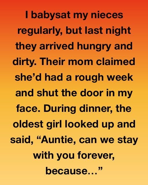 I babysat my nieces regularly, but last night they arrived hungry and dirty. Their mom claimed she’d had a rough week and shut the door in my face. During dinner, the oldest girl looked up and said, “Auntie, can we stay with you forever, because we’re happier here?”