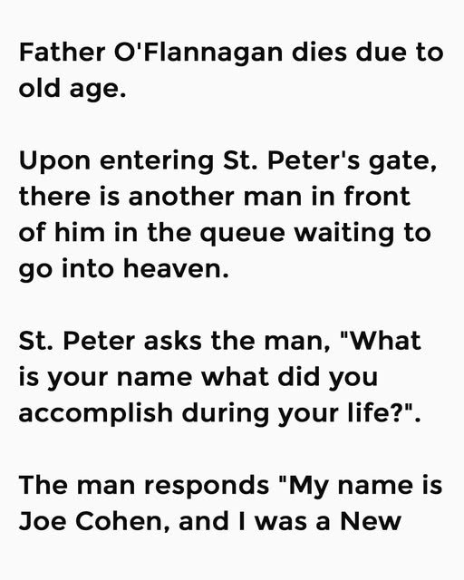 Father O’Flannagan dies due to old age. Upon entering St. Peter’s gate, there is another man in front of him in the queue waiting to go into heaven.