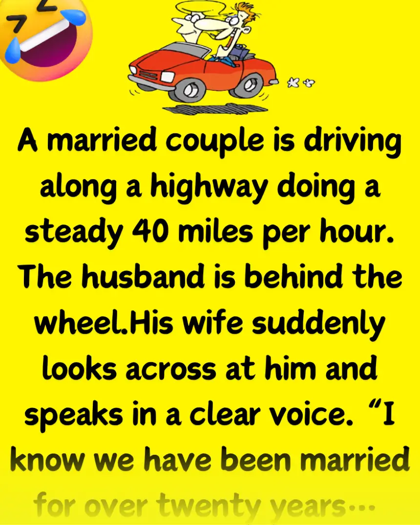 The husband is behind the wheel.His wife suddenly looks across at him and speaks in a clear voice.