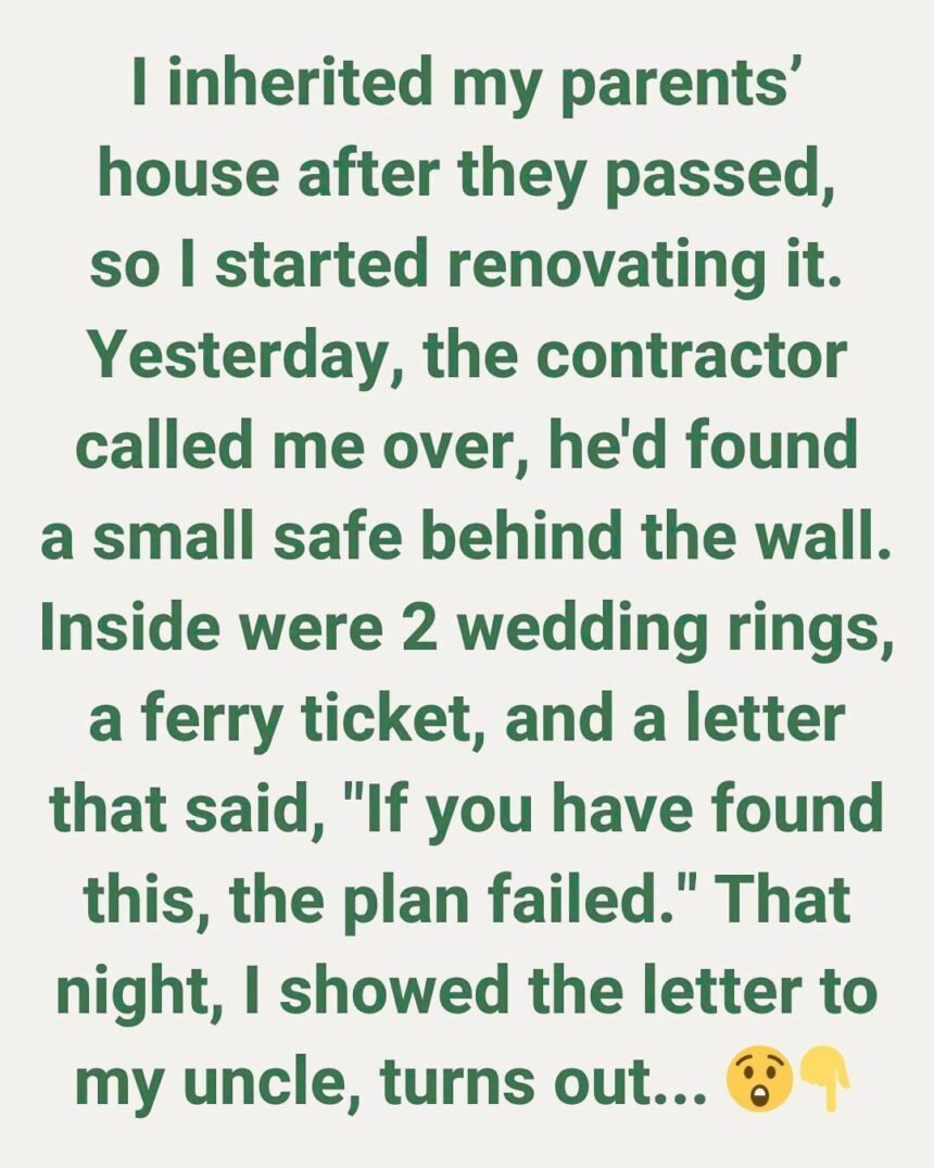 When I walked in, he pointed to a hollow section of wall he’d opened. Inside was a small, dust-covered safe, wedged between the studs as if someone had tucked it away in a hurry. My heart thudded as he handed it to me.