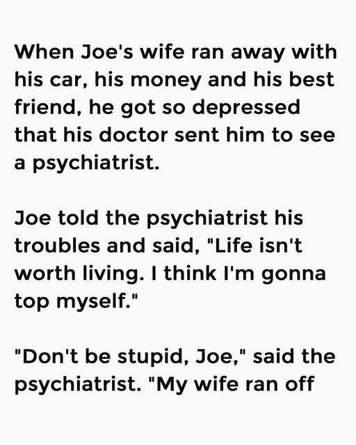 When Joe’s wife ran away with his car, his money and his best friend, he got so depressed that his doctor sent him to see a psychiatrist. Joe told the psychiatrist his troubles and said, “Life isn’t worth living. I think I’m gonna top myself.”