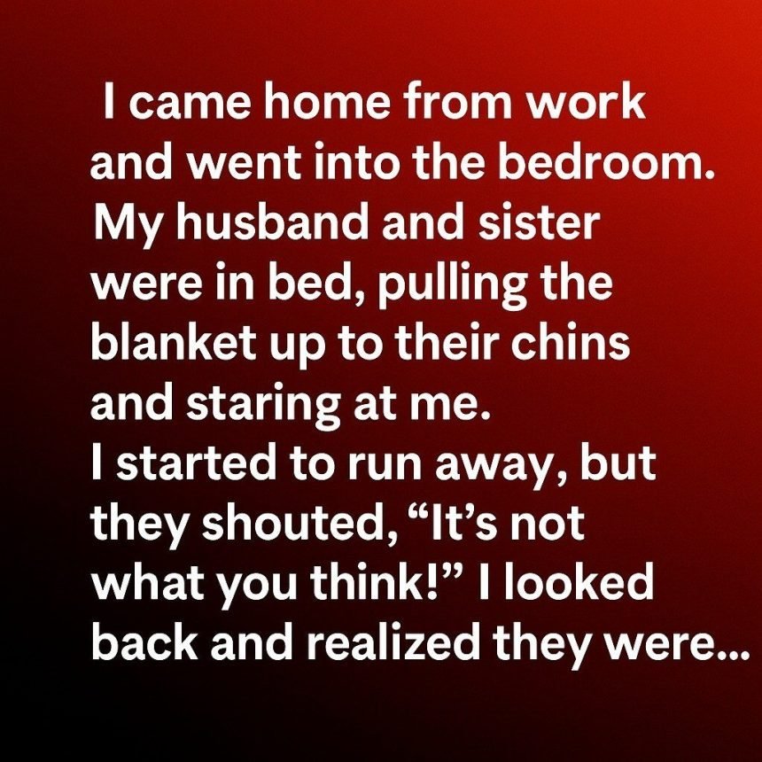 I came home late from work one evening, exhausted and ready to collapse into bed. As I walked into the bedroom, I froze. My husband and my sister were under the covers together, the blanket pulled up tight to their chins.