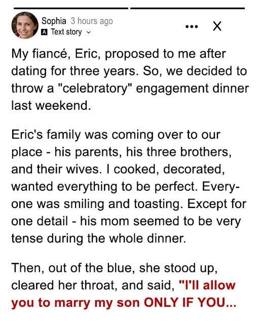 When Eric got down on one knee and asked me to marry him, I thought I was saying yes to the love of my life. I had no idea I was also saying yes to a strange, humiliating family tradition—a so-called “wife test” that would turn my world upside down. What was supposed to be a joyful engagement dinner turned into a nightmare that made me question everything about love, loyalty, and being accepted.