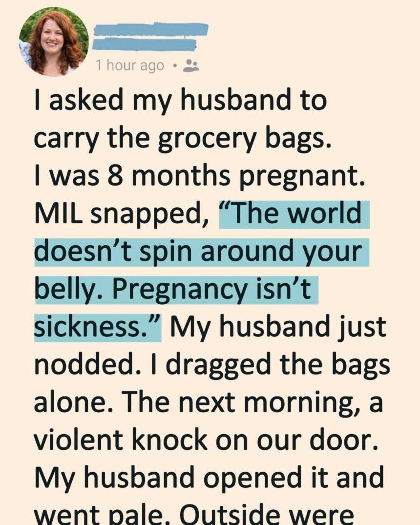 It wasn’t a demand, just a simple request—one that felt reasonable given my condition. But before he could even respond, my mother-in-law’s sharp voice cut through the air like a blade. “The world doesn’t spin around your belly,” she snapped, her eyes narrowing with disdain.