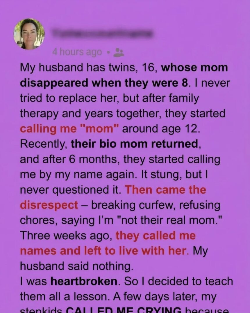 What hurt most wasn’t just their behavior—it was my husband’s silence. He watched the tension grow and said nothing, leaving me to absorb the impact alone. Three weeks later, the twins packed their bags and left to live with her.