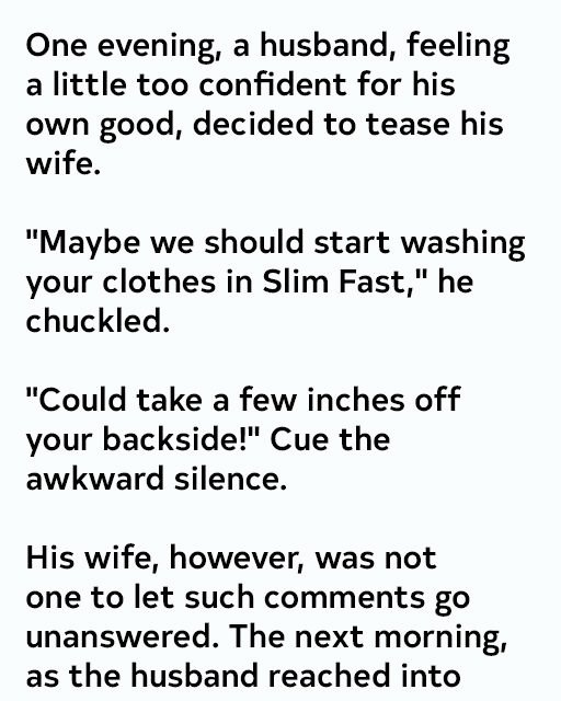 One evening, a husband—feeling a little too confident for his own good—decided to tease his wife. “Maybe we should start washing your clothes in Slim Fast,” he chuckled. “Could take a few inches off your backside!”