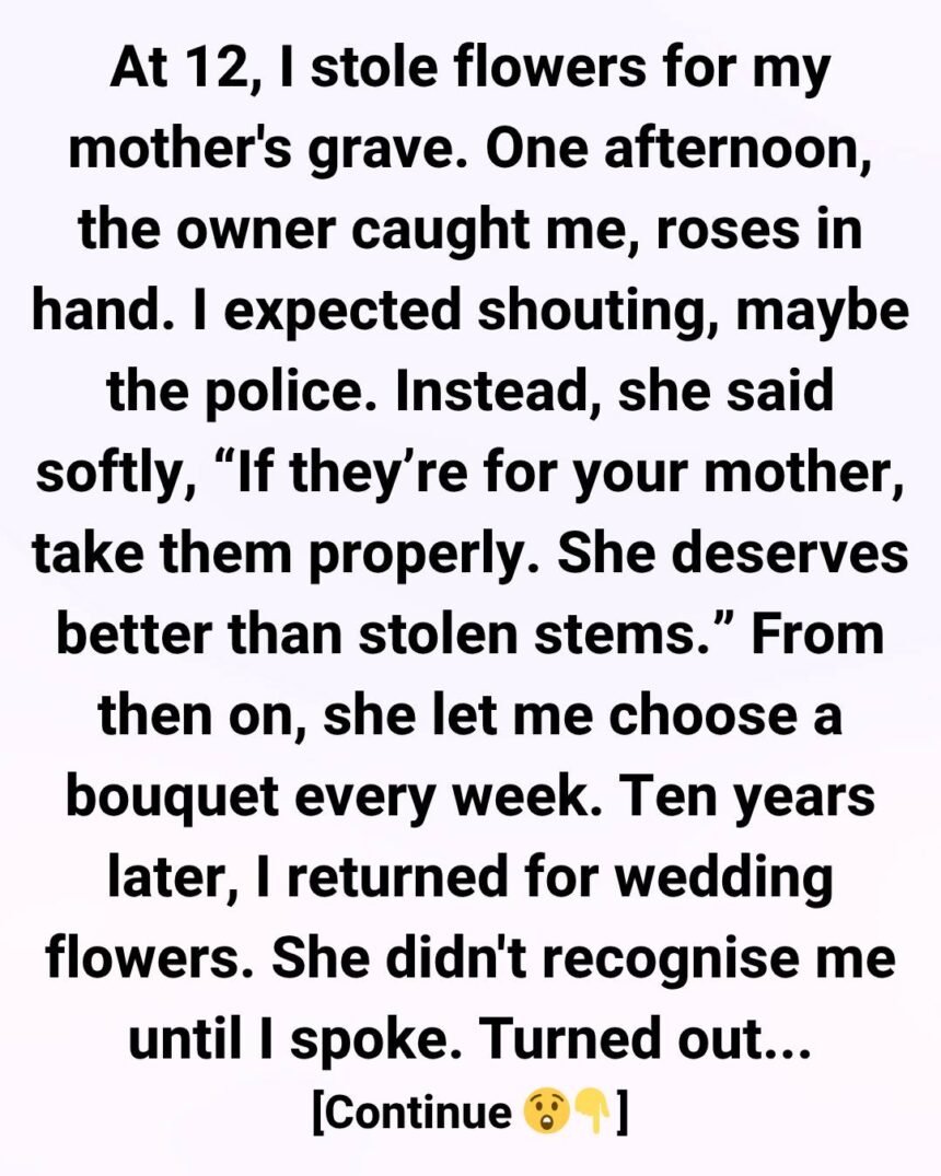 At twelve, I used to steal flowers from a small shop down the street to place on my mother’s grave. She had passed away the year before, and my father worked long hours, too tired to notice how often I slipped out. I didn’t have any money, and something about bringing her flowers made me feel closer to her, as if beauty could bridge the distance between the living and the lost.