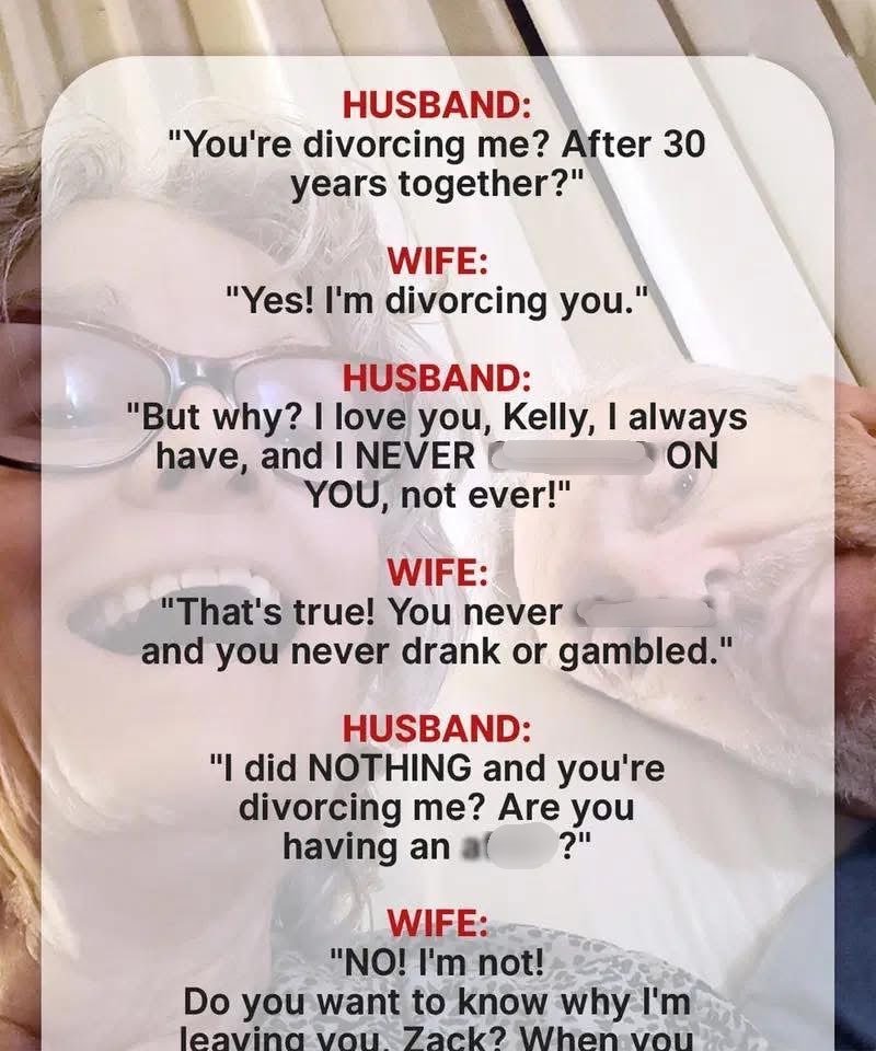 “But…Then why?” he asked angrily. “I did NOTHING and you’re divorcing me? Are you having an affair?”
